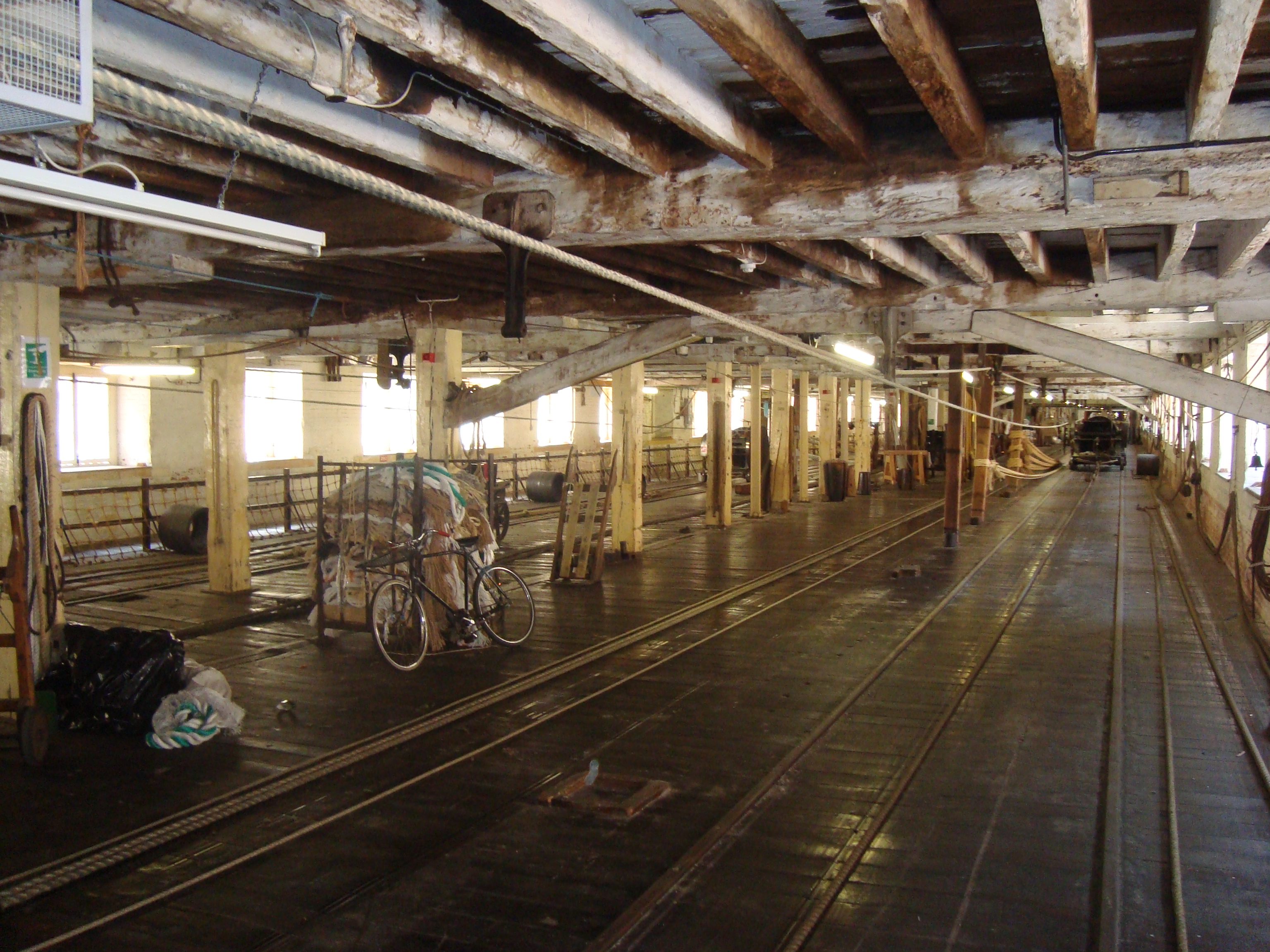 At Chatham the photos were taken on the ‘behind the scenes’ tour for NDS members in June 2010 led by architect Edward Sargent and Nigel Howard, historic environment and building project manager. It included parts of the dockyard not generally open to the public. The Double Ropery, built 1781–91 on the site of an earlier ropehouse, was a major feature of the visit. It is 1,265’ long and required 220 men to lay the largest 24” diameter cables along the 1,128’ laying floor. Visitors can still see its Georgian machinery making rope. Maudslay manufactured the 1811 forming machines and frames for the register plates. A steam engine was installed c.1836 and a capstan is thought to date from this time. We also saw the attics above where apprentices spun hemp. The building was restored and re-roofed in 1982. A report on this visit appears in Dockyards, 15(2), 3-5 (Dec 2010).